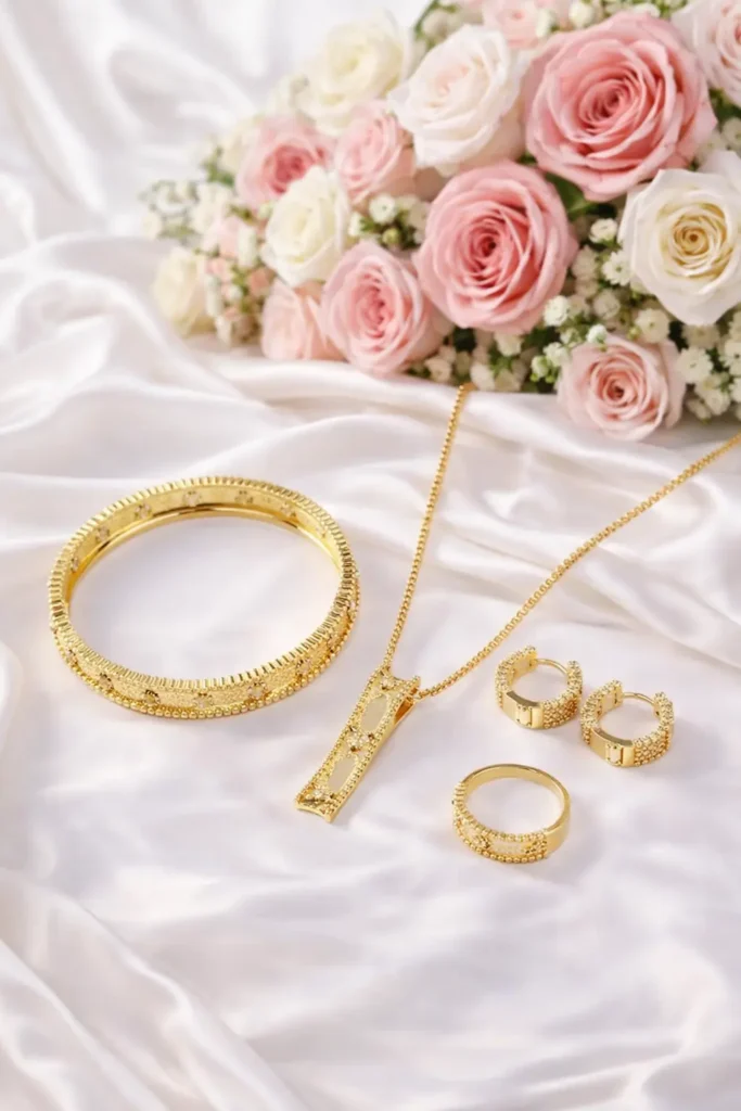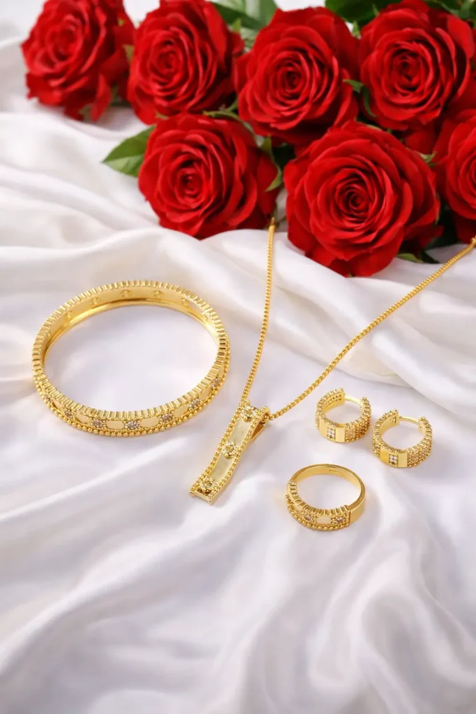 هذه المجموعة الرائعة من المجوهرات المطلية بالذهب تجمع بين الأناقة والجمال لتضفي لمسة من الفخامة على إطلالتك. تتألف المجموعة من قلادة، أقراط، وخاتم، مما يجعلها مثالية لارتدائها في مختلف المناسبات الخاصة بك. بفضل جودة المواد المستخدمة في تصنيعها والاهتمام بالتفاصيل، توفر هذه المجموعة متانة عالية ولمسة من الأناقة التي تدوم طويلاً. سواء كنت تبحث عن هدية رائعة لشخص مميز في حياتك أو ترغب في تحديث مجموعتك الخاصة بالمجوهرات، فإن هذه المجموعة تقدم لك الخيار المثالي بقيمة ممتازة. استمتع بإطلالة ساحرة ومميزة مع هذه المجموعة الرائعة التي ستضيف لمسة لامعة إلى يومك.